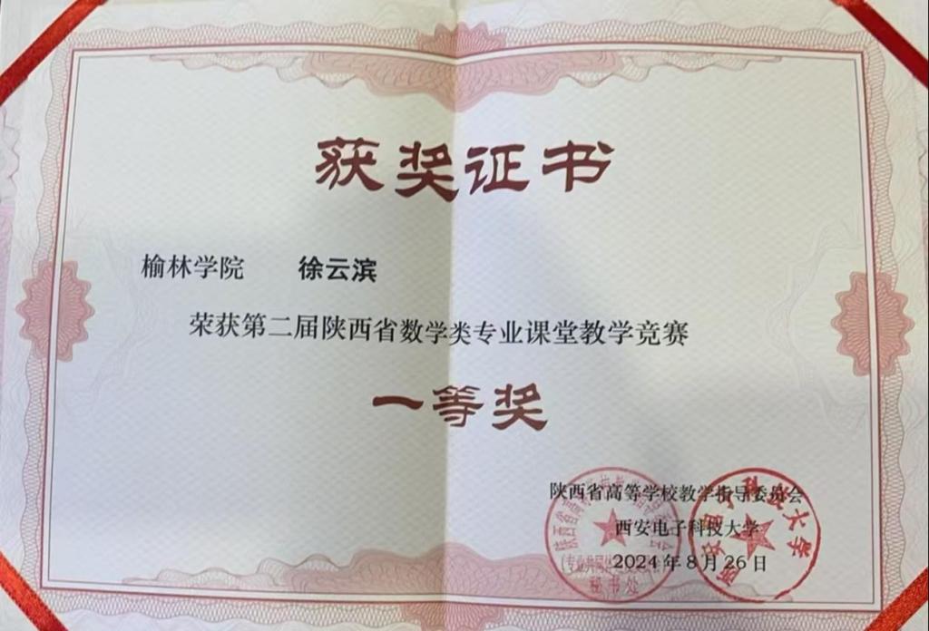 2024年11月2日至3日,第四届陕西省高等公司数学类专业建设研讨会暨第二届陕西省高校数学类专业课堂教学竞赛颁奖仪式在西安电子科技大学举行。徐云滨副教授讲授的“常微分方程”课程获得一等奖。