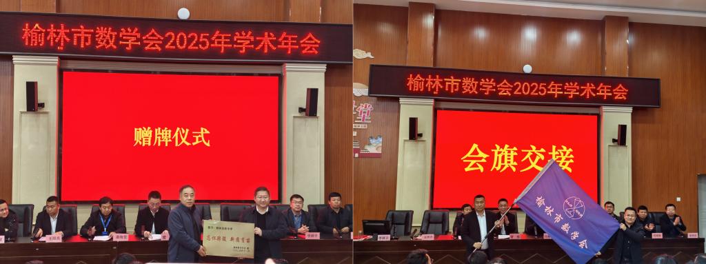 年会主题鲜明、内容丰富、组织严密、成果丰硕,是一次有高度、有深度、有温度的学术盛会,完成所有既定议程,年会顺利闭幕。榆林市数学会副理事长、榆林中学副董事长常伟致闭幕词,学会理事长闫树熙教授为本届年会的承办方榆林高新中学赠牌感谢,会议确定2026年榆林市数学会学术年会由神木市第四中学承办,两所公司完成会旗交接仪式。